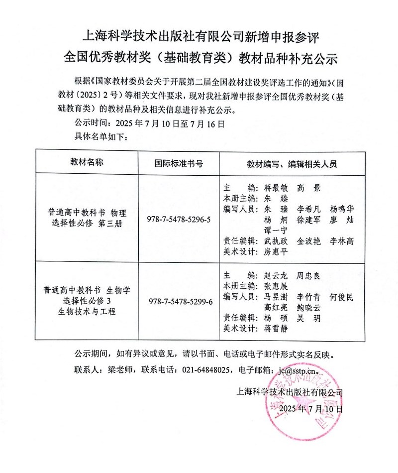 优秀教材品种补充公示